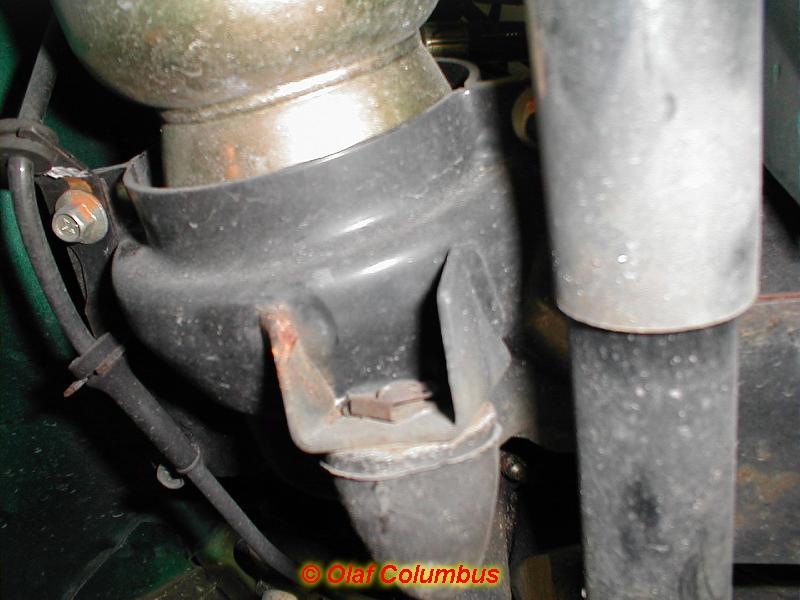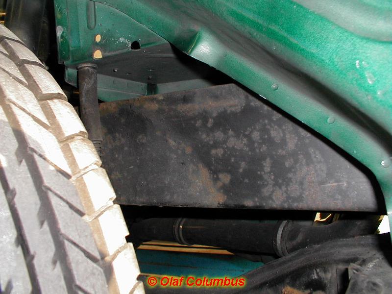 View into left front the wheel-house, from ahead. The red arrow points to a rubber seal, the blue one at the foliage, witch accumulated behind the plastic lining (witch is removed here). |